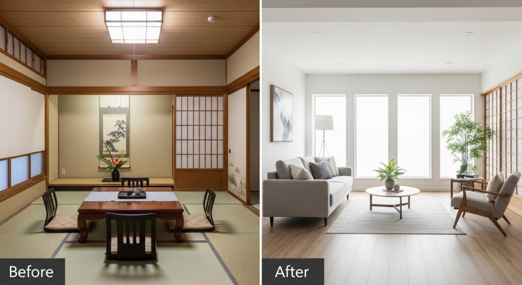 また現代的なインテリアや家電にもマッチしやすく、使い勝手の良い空間へと生まれ変わります。さらに和室特有の「段差」や「押し入れ」も、洋室へリフォームすることでバリアフリー化・クローゼット化が可能です。他にも壁や天井を明るい色合いにすることで、より開放的な印象を演出できます。