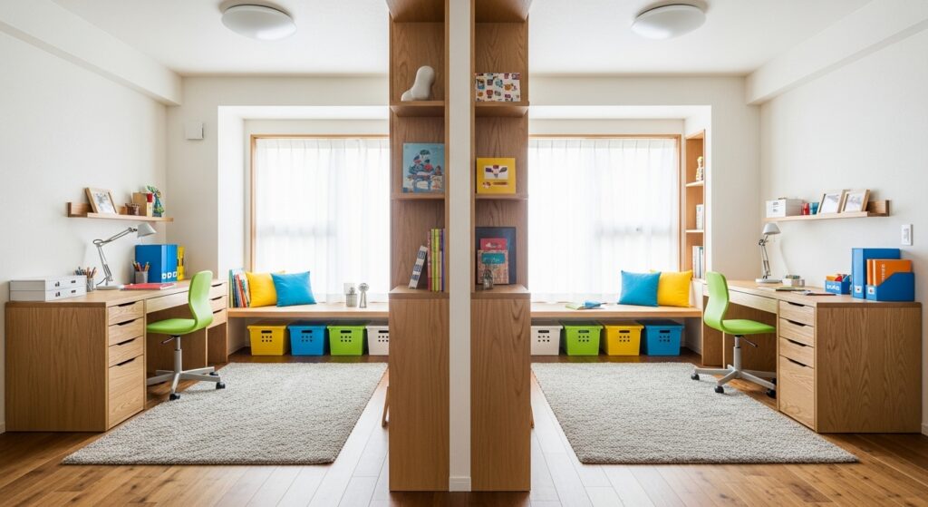 一方、将来的に再び一室に戻したい場合には、取り外し可能な仕切りを採用するのがおすすめです。照明やコンセントの増設、窓位置の調整なども含めて設計すれば、より快適な子供部屋に仕上がります。